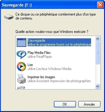 4) Voilà tout. Maintenant, à chaque fois que vous insérerez votre clé USB, vous aurez l’option “Sauvegarde” qui permet de sauvegarder vos données dans le répertoire choisi :