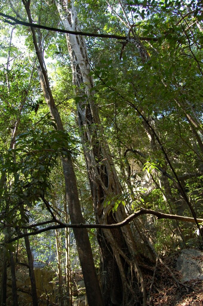 Certains arbres sont étouffés par des lianes parasites impressionnantes par leur taille. Algunos árboles son ahogados por las vides parásitos por su tamaño impresionante.