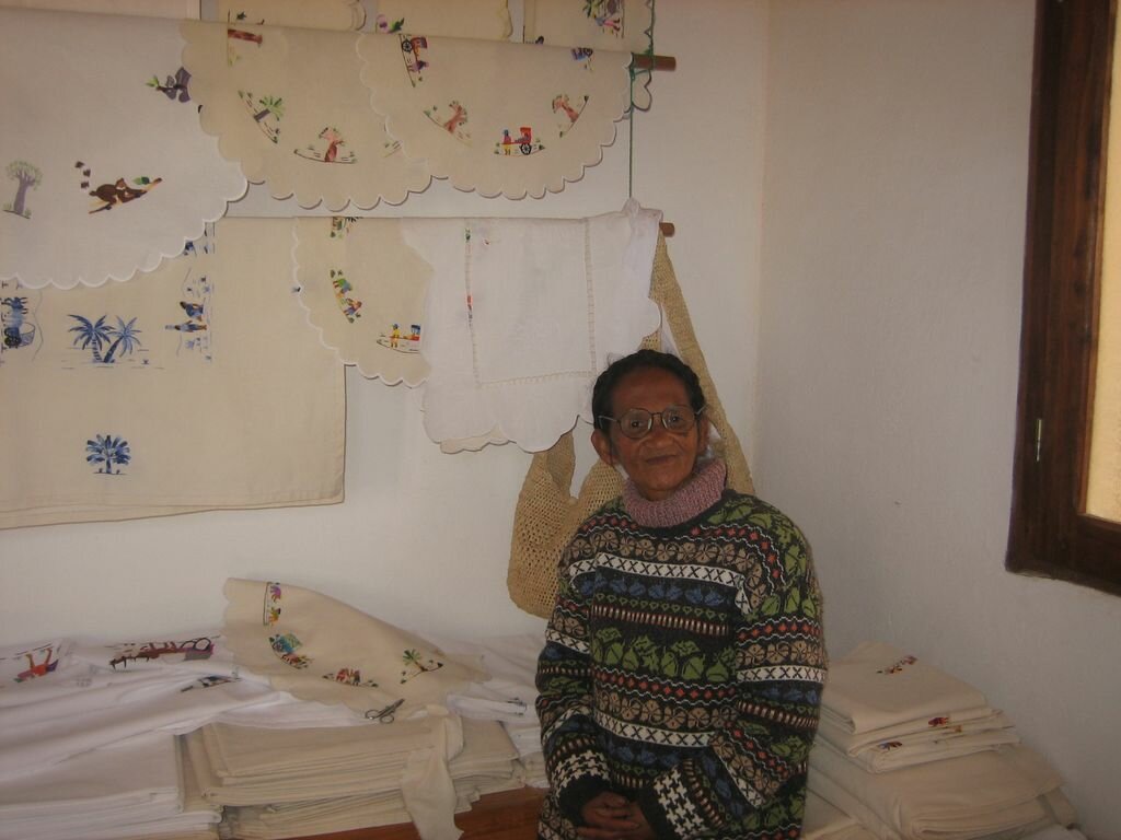 Ici, une broderie, où le dessinateur vient se donner en spectacle. Aquí, el bordado, donde el diseñador tiene que hacer un espectáculo. Il dessine des scènes de la vie quotidienne sur des nappes. Dibuja escenas de la vida cotidiana en los manteles.