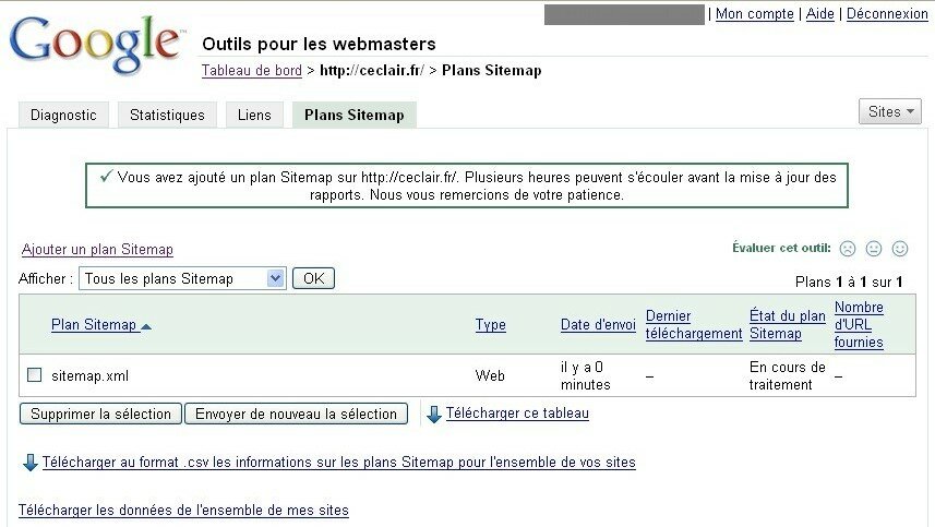 Je pensais que les robots de google le détectaient automatiquement, puisque j’ai utilisé le nom standard : sitemap.xml. Eh bien il n’en est rien, d’après ce que j’ai pu constater sur les Outils pour Webmasters de Google!